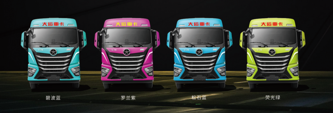 除了传统的朱砂红、珠光白的颜色外,还有多种年轻人喜欢的多巴胺色系可选,碧波蓝、松石蓝、荧光绿,罗兰紫,每一个颜色的重卡开在运输路上,都会是一道绝佳的风景线。